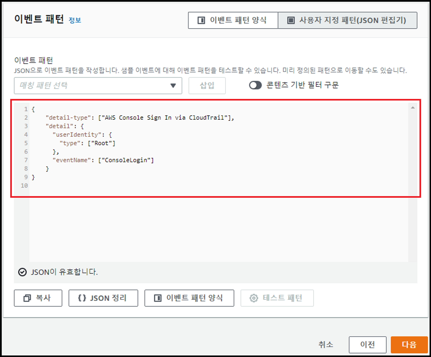 - JSON(1) 또는 JSON(2)를 활용하여 이벤트 패턴 작성