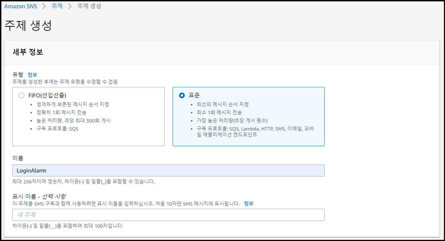 - 관리 콘솔에서 [SNS] 검색 → [주제] 메뉴 → [주제 생성] 클릭