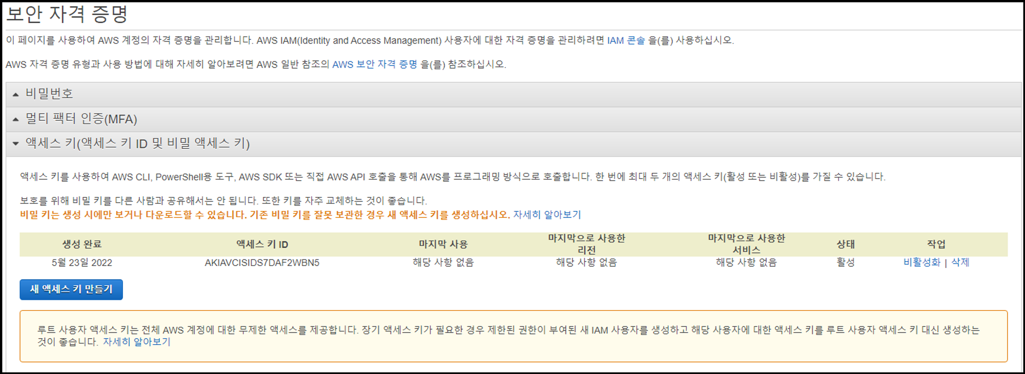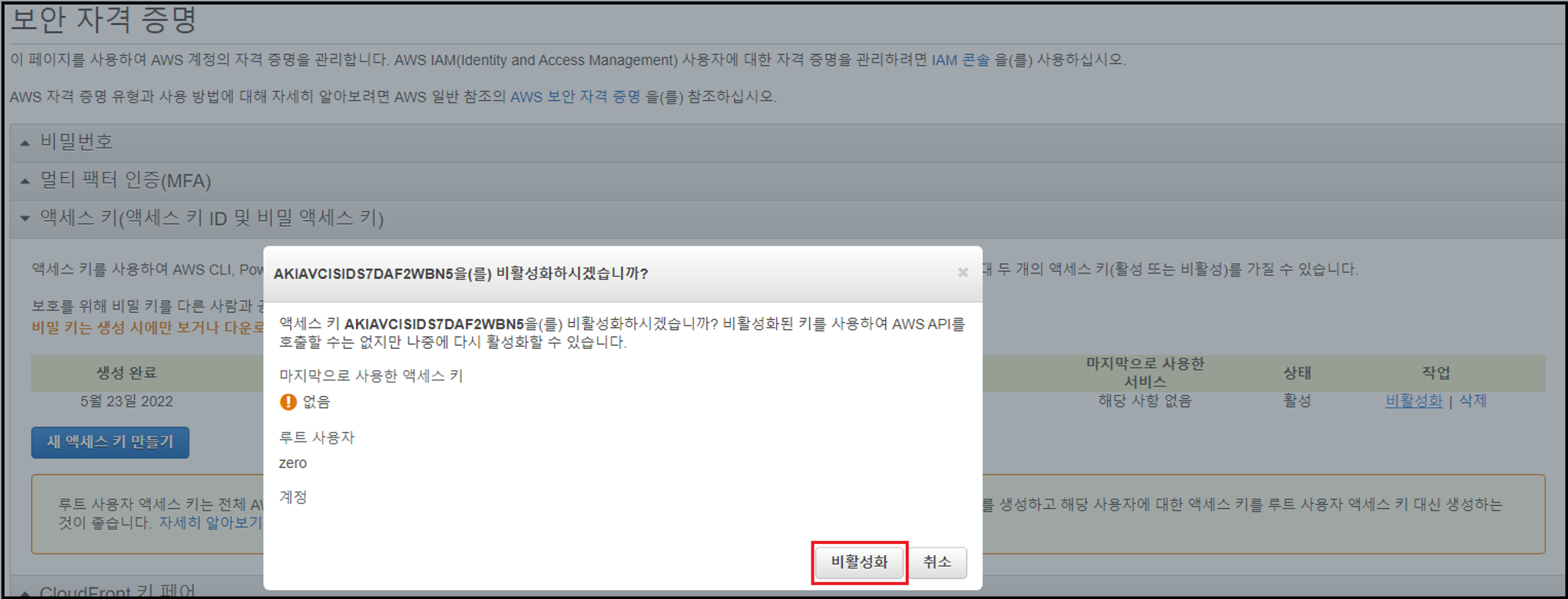 - 생성된 액세스 키를 비활성화