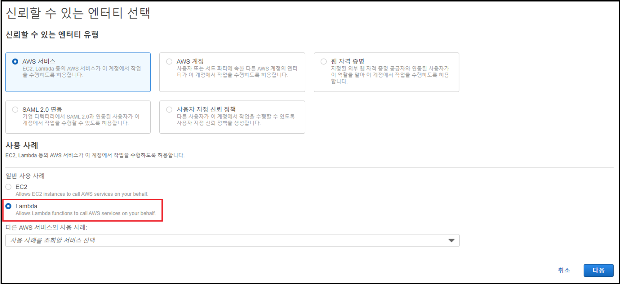- IAM 서비스에서 [역할] 메뉴 → [역할 만들기] 클릭
