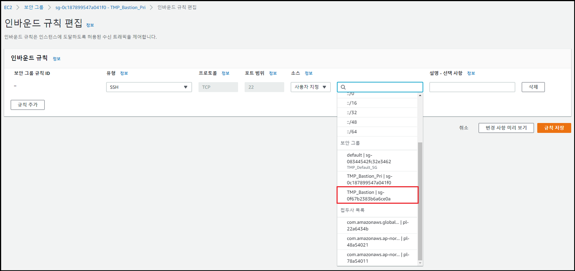 - Bastion Host의 SecurityGroup 인바운드 규칙에 담당자의 IP에서만 SSH 접근을 허용하는 정책 추가