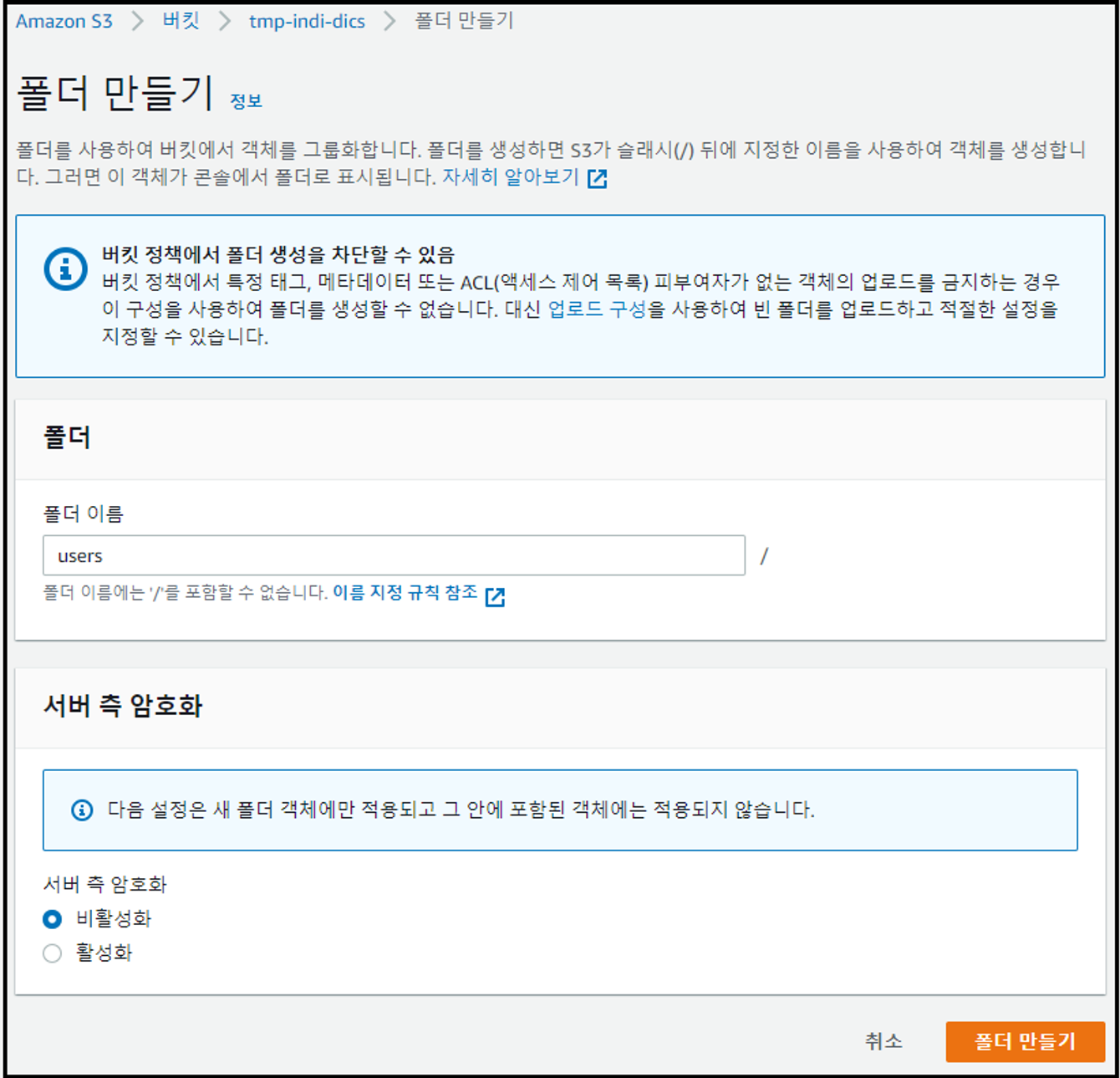 - 생성한 버킷으로 이동 → [폴더 만들기] 클릭