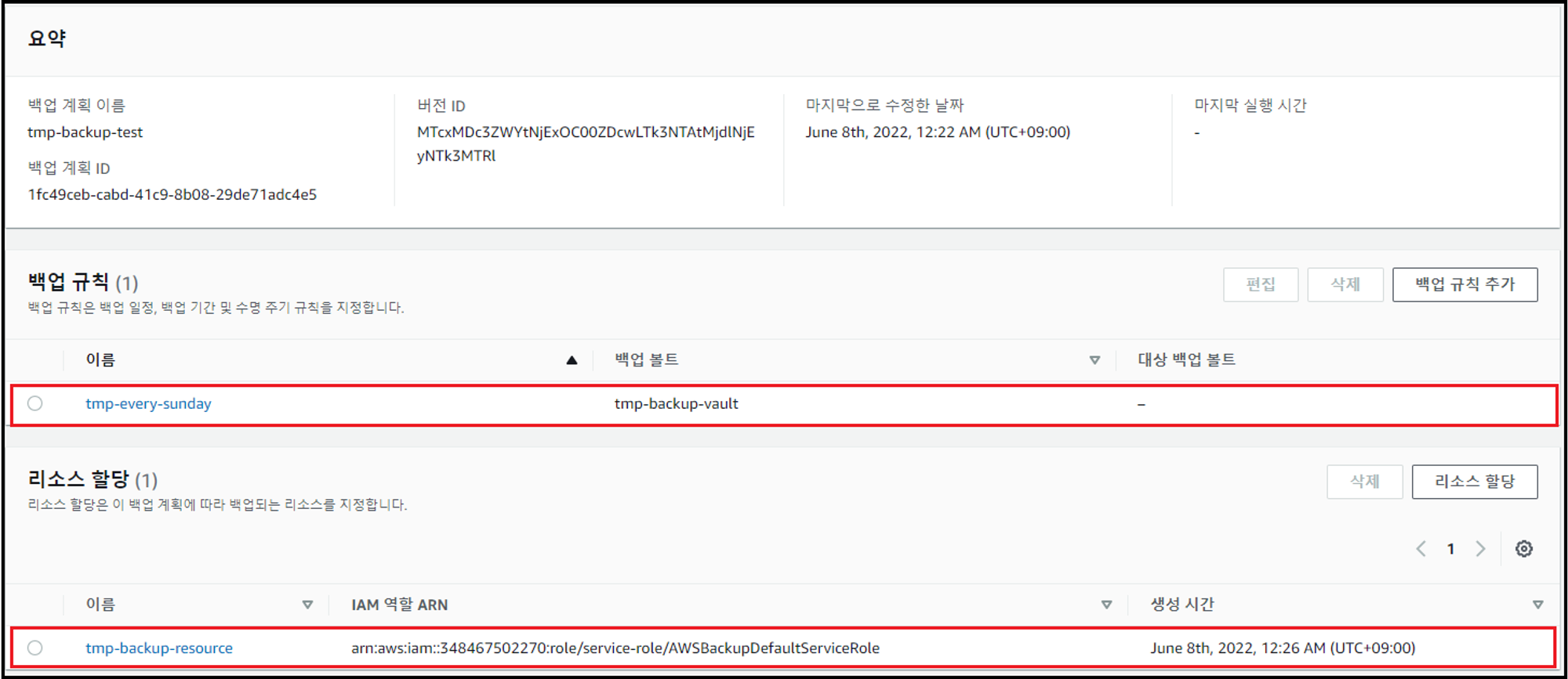 - 관리 콘솔에서 [Backup] 검색 → [백업 계획] 메뉴 → Prod 환경에 대한 백업 계획 생성 여부 확인