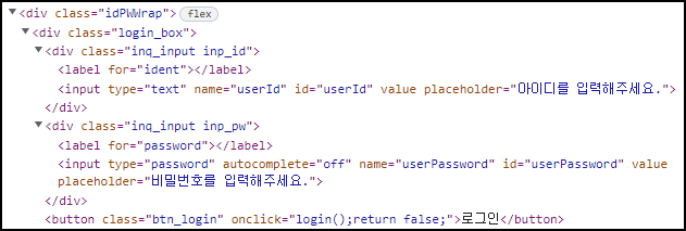 Selenium을 사용하기 위한 작업과 Slack bot 설정을 모두 마쳤으니 이제는 크롤링을 할 대상을 파악할 단계입니다. IP정보를 크롤링 해올 C-TAS 홈페이지는 로그인이 필요하기 때문에 먼저 로그인 페이지에 대한 분석을 먼저 시작합니다. 개발자 도구에서 확인해보니 "idPWWrap"이라는 div에서 userId와 userPassword에 각각 아이디와 패스워드를 입력받고 있습니다.