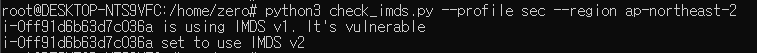 IMDS v1으로 설정된 인스턴스를 확인해 v2로 변경하는 파이썬 도구를 깃헙(링크)에 올려두었습니다. aws configure 설정 후 다음과 같이 AWS Profile과 리전을 입력하면 자동으로 IMDS v1을 v2로 변경하고 해당 인스턴스 ID를 출력합니다.