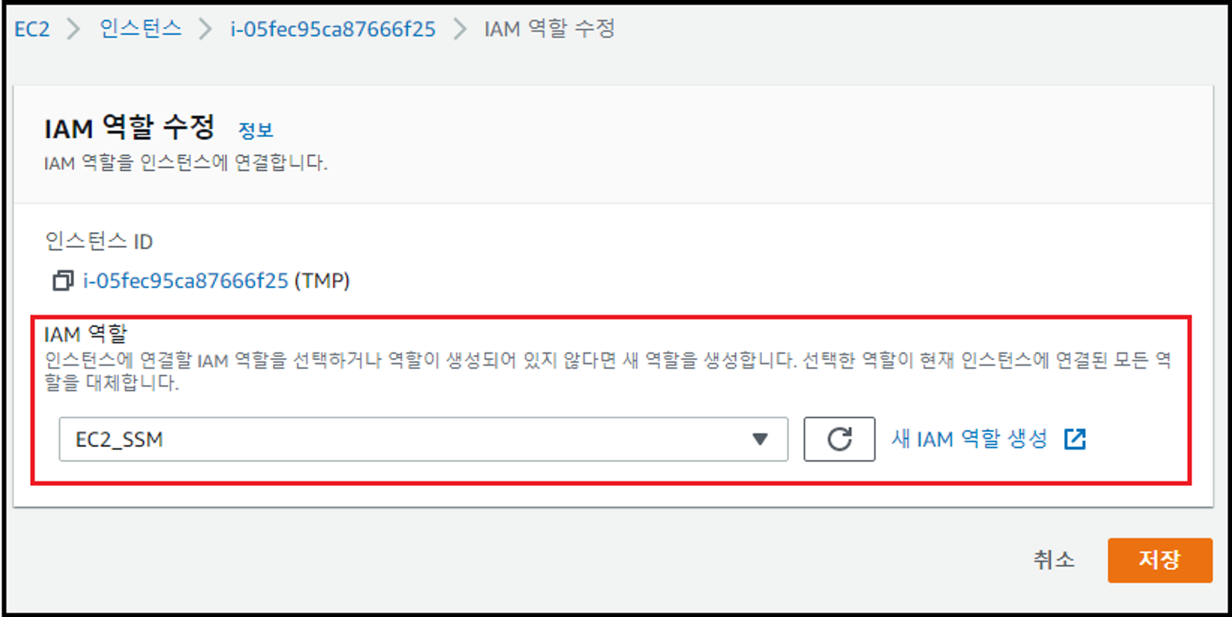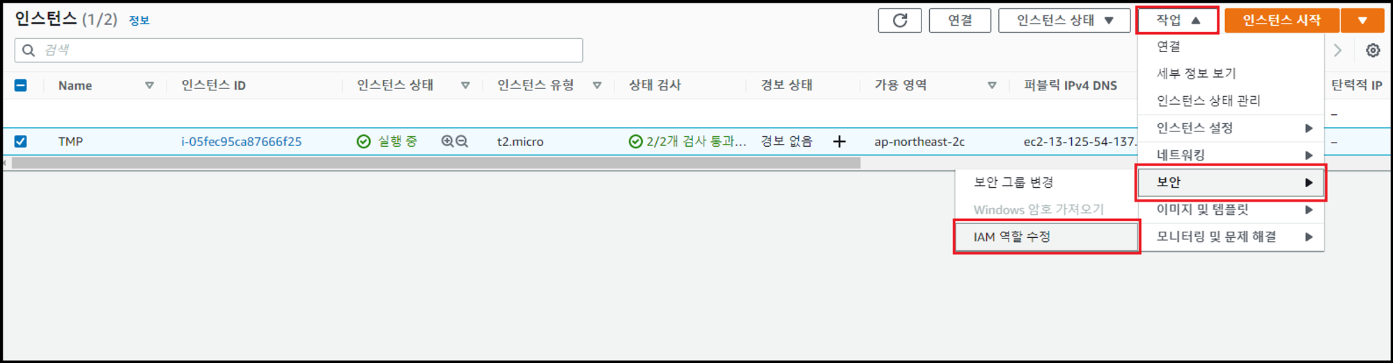 - EC2 서비스에서 [인스턴스] → [작업] → [IAM 역할 수정] 클릭