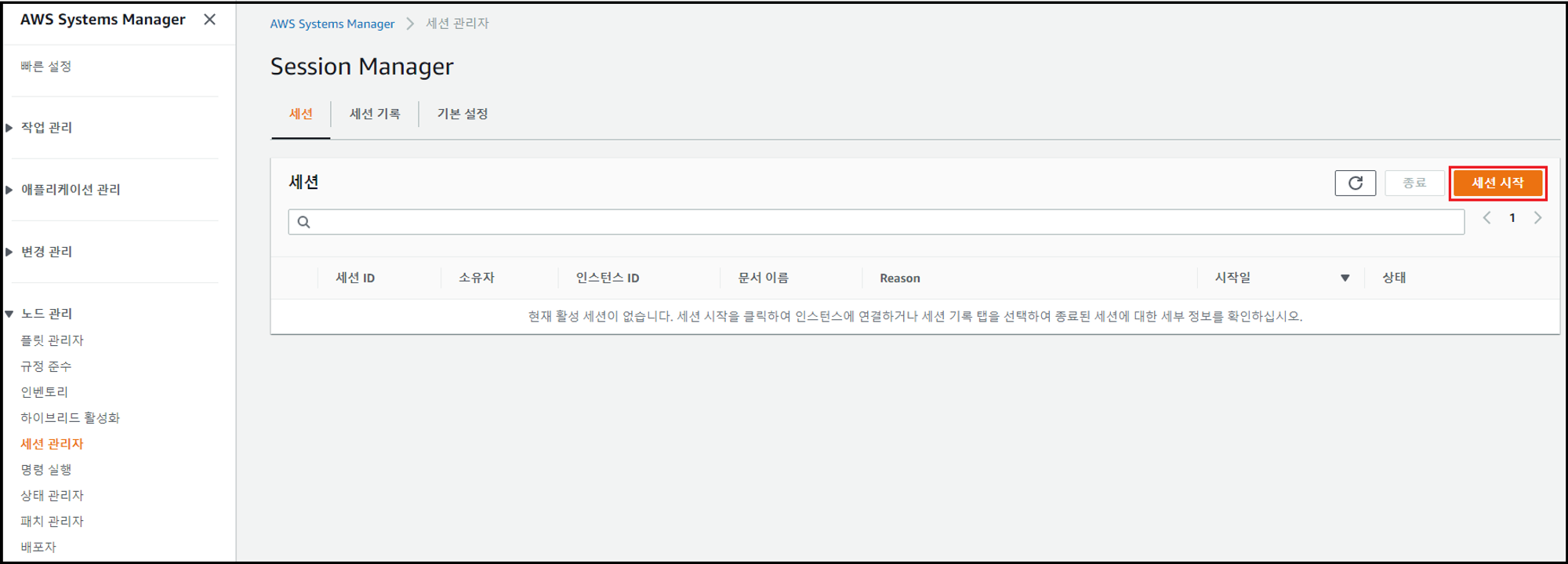 - [대상 인스턴스] 항목에서 세션 접속이 활성화된 인스턴스 존재 여부 확인