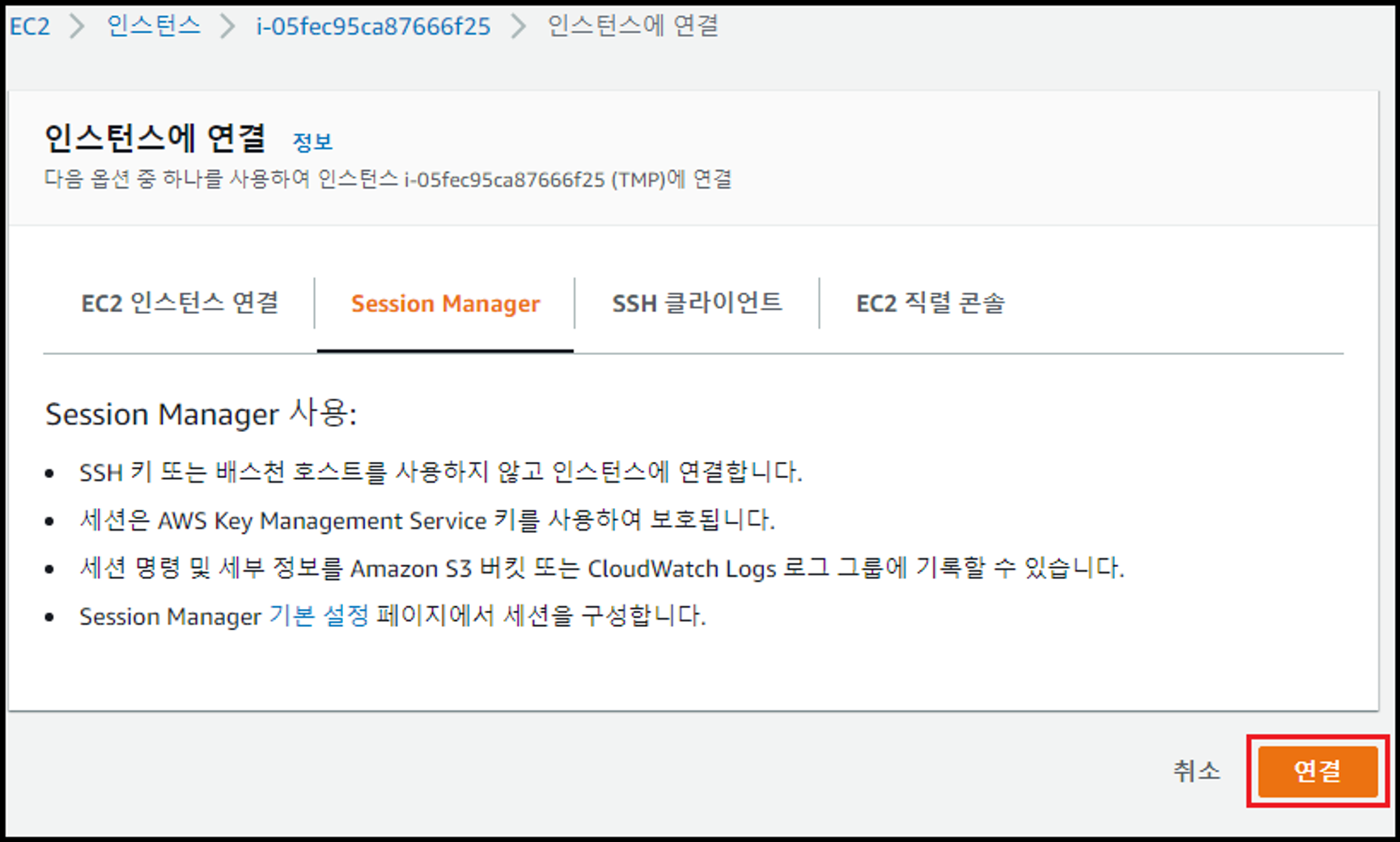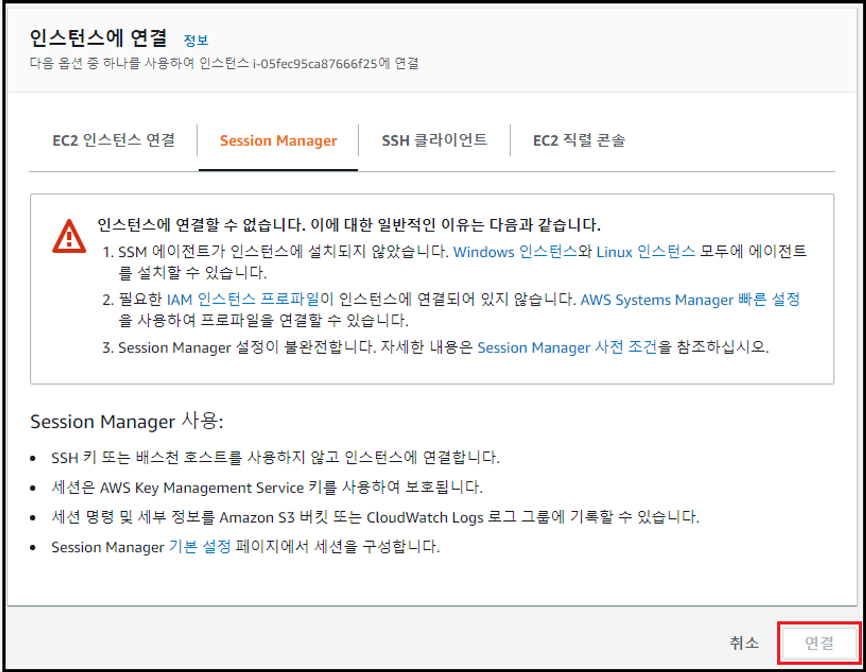 - [Session Manager] 탭의 [연결] 버튼 비활성화 여부 확인