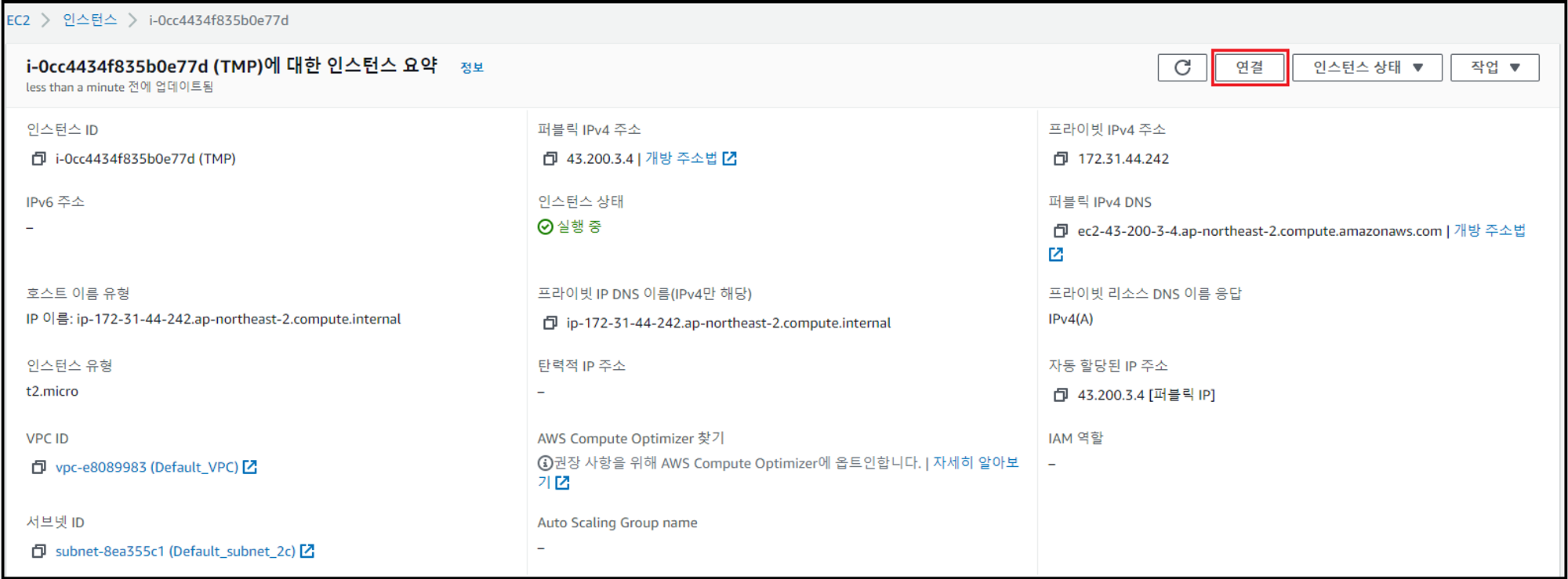 - EC2 서비스에서 [인스턴스] → [인스턴스 세부 정보] → [연결] 클릭