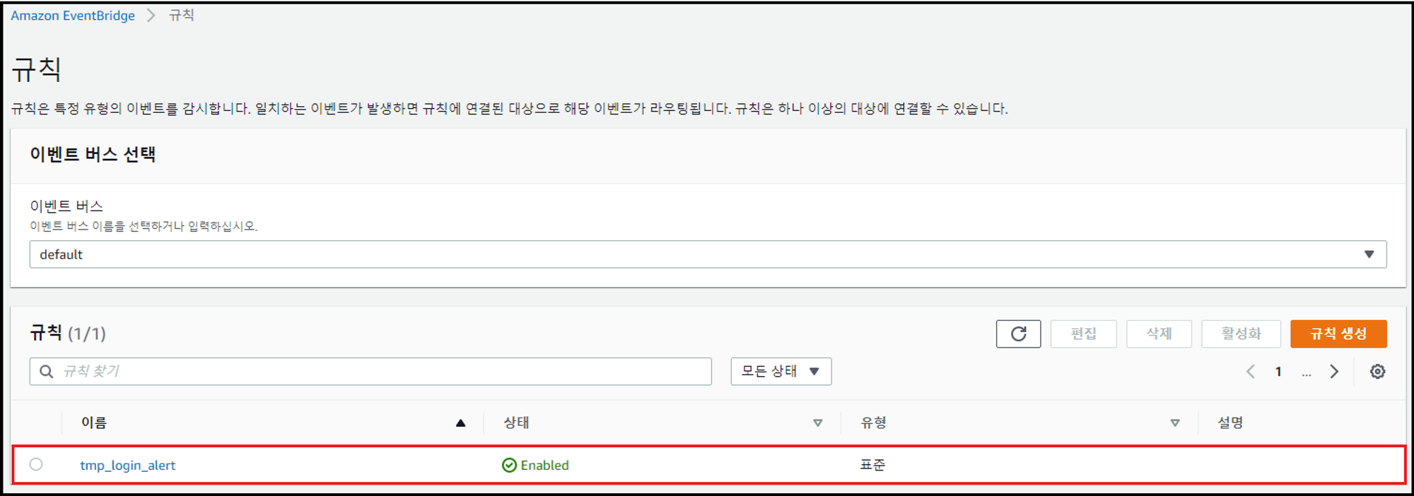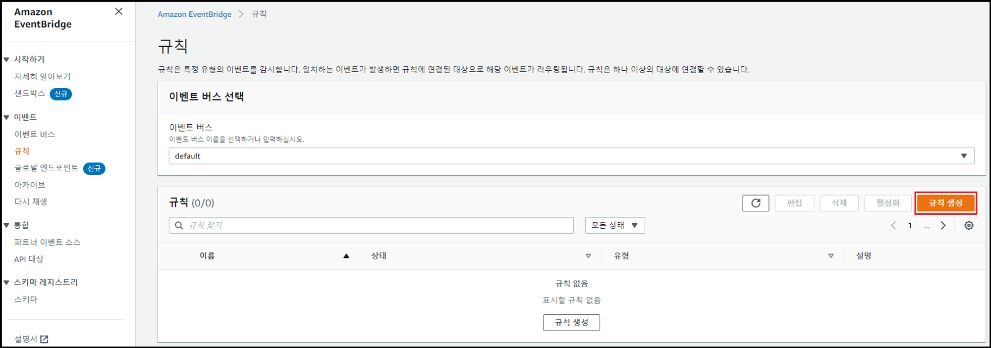 - 관리 콘솔에서 [Eventbridge] 검색 → [규칙] 메뉴 → [규칙 생성] 클릭