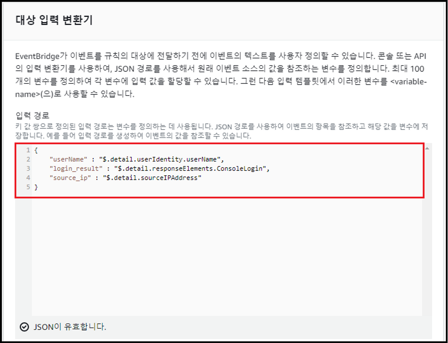 - JSON(3)을 활용하여 [대상 입력 변환기] 설정