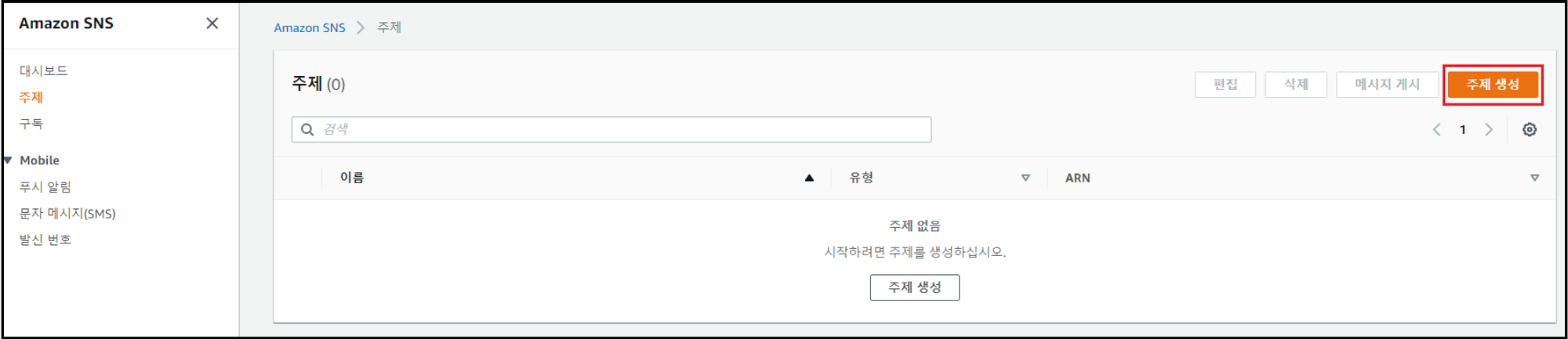 - 관리 콘솔에서 [SNS] 검색 → [주제] 메뉴 → [주제 생성] 클릭