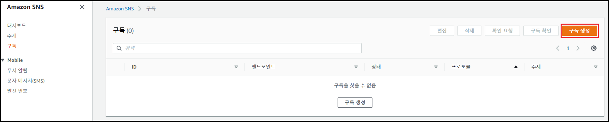 - [구독] 메뉴 → [구독 생성] 클릭