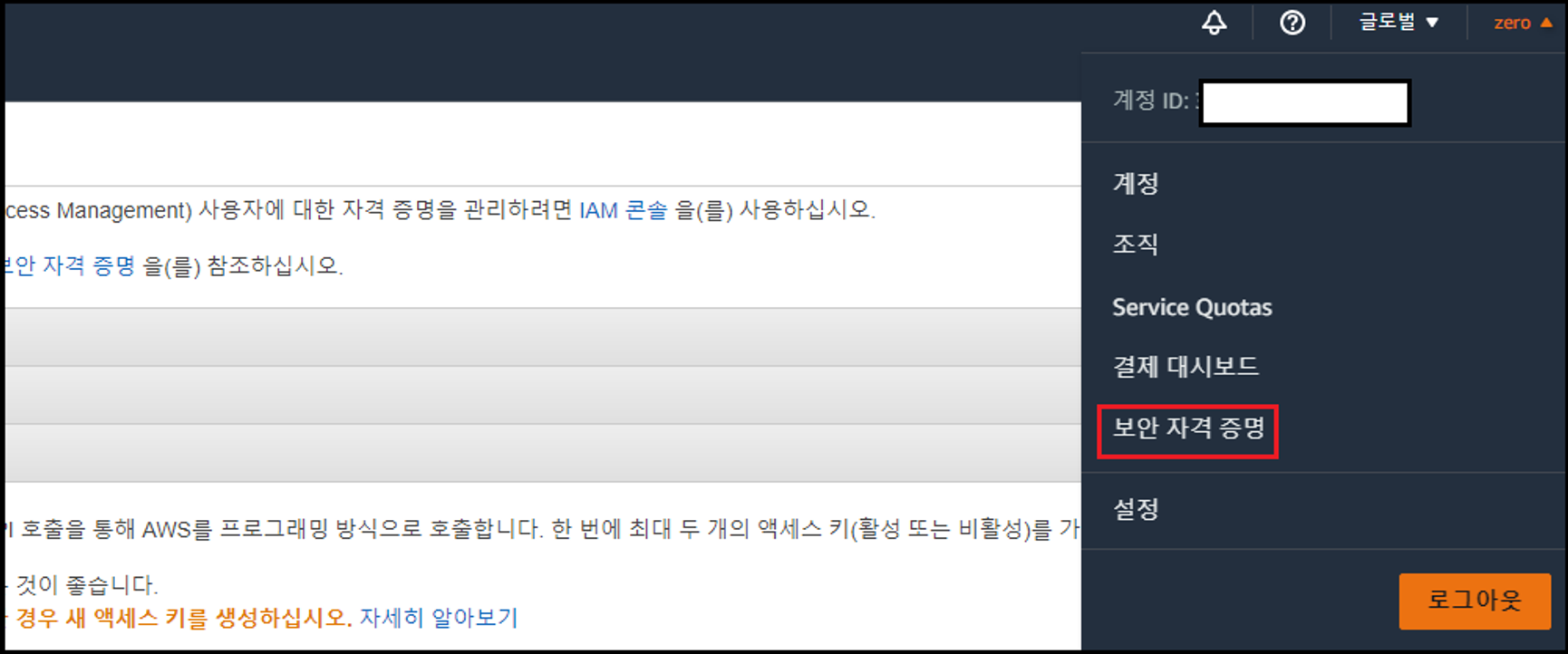 - [보안 자격 증명] 클릭