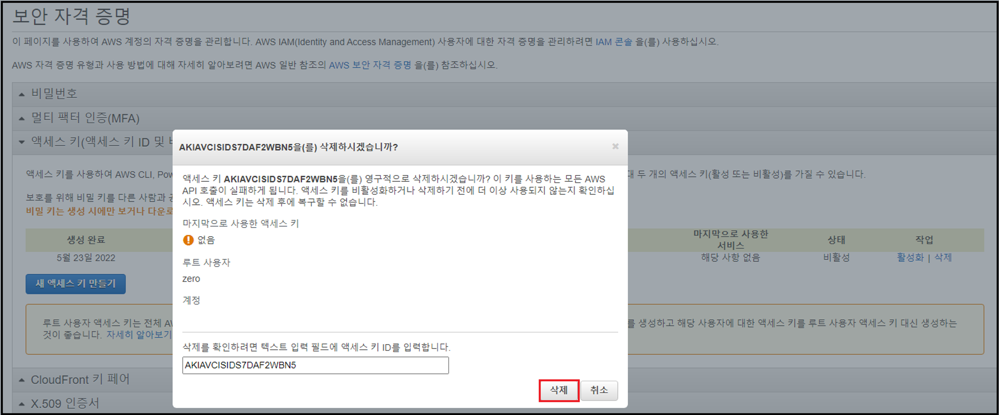 - 비활성화된 액세스 키를 삭제