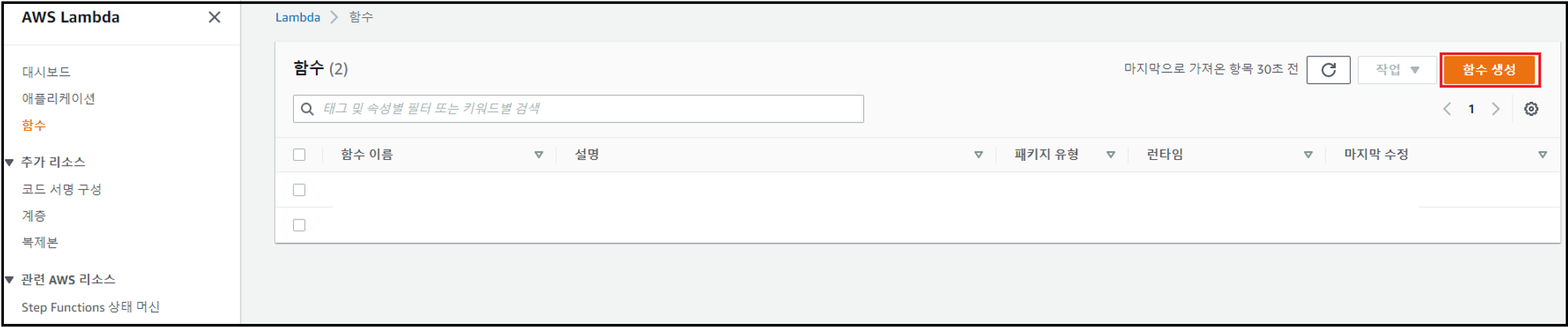 - 관리 콘솔에서 [Lambda] 검색 → [함수 생성] 클릭