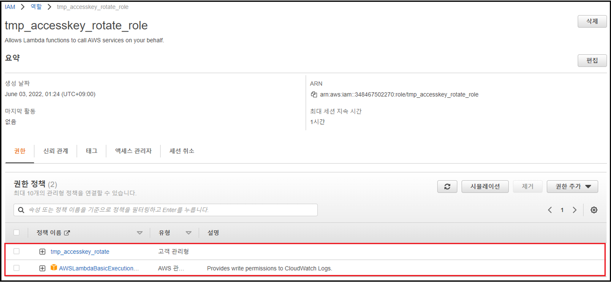 - JSON(1)을 활용해 만든 정책과 [AWSLambdaBasicExecutionRole] 정책 할당