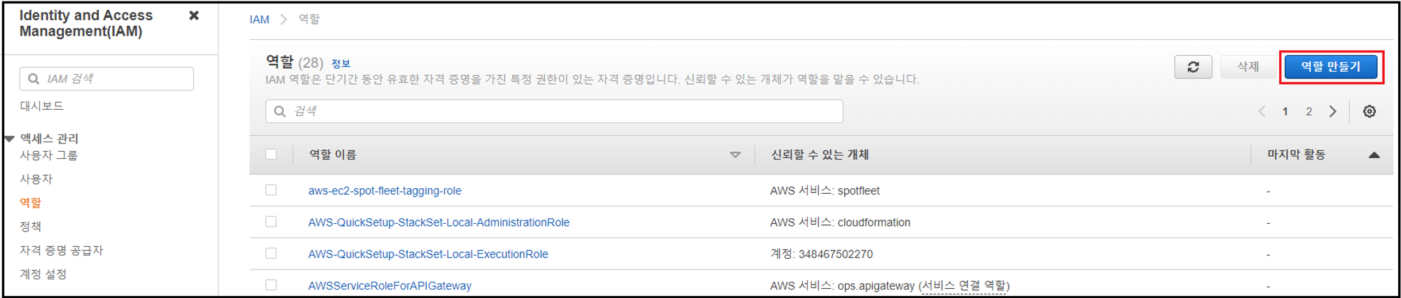 - IAM 서비스에서 [역할] 메뉴 → [역할 만들기] 클릭