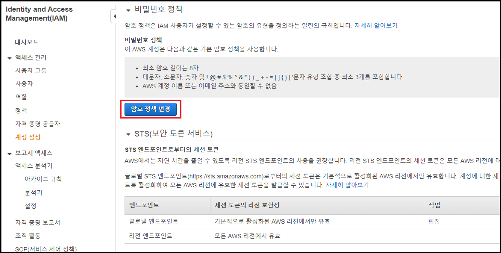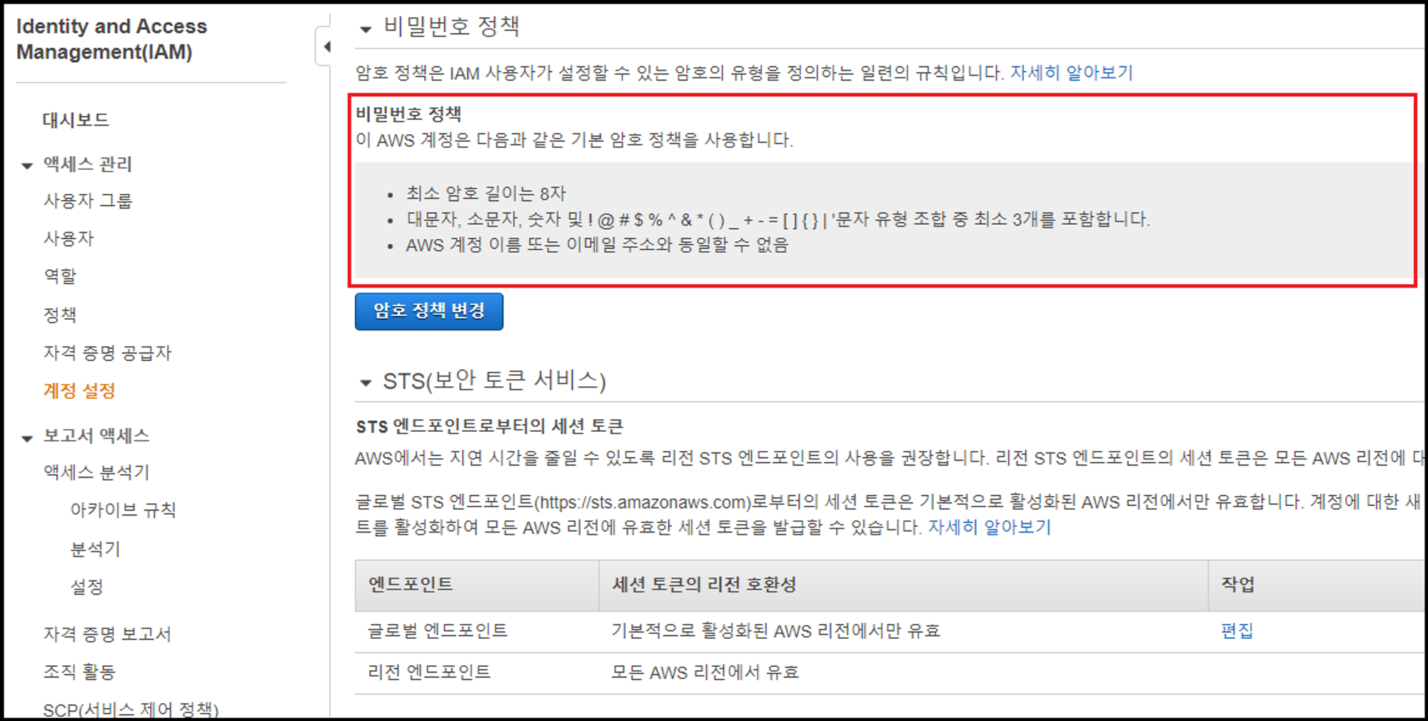 - [비밀번호 정책] 항목에서 [암호 정책 변경] 클릭