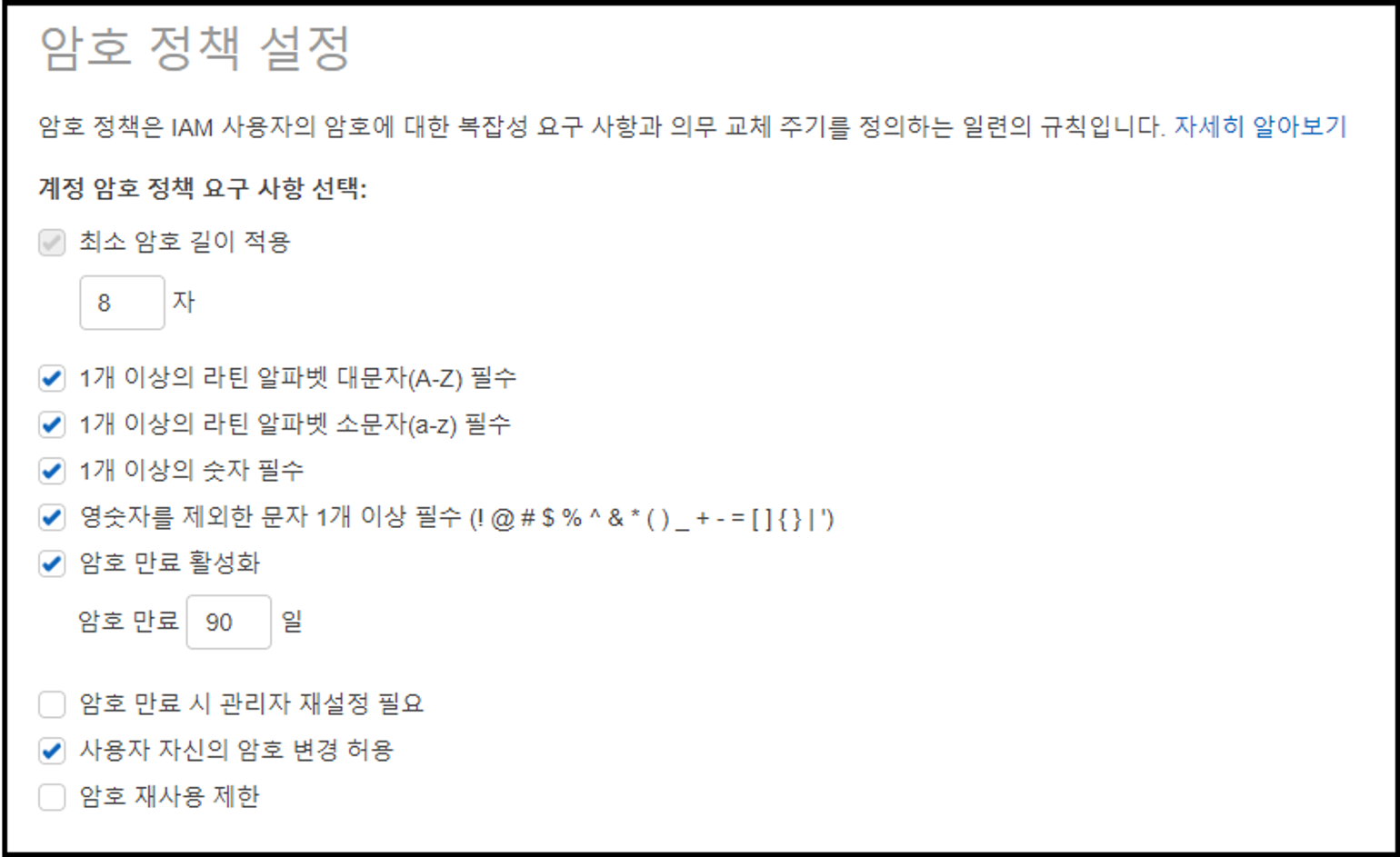 - 관리 콘솔에 접근 가능한 IAM 계정의 비밀번호 복잡도 및 변경 주기 정책을 설정하여 brute force 등 계정 탈취 공격에 대한 보호 필요