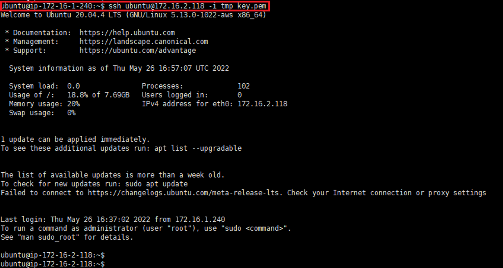 - ssh [프라이빗_인스턴스_계정]@[프라이빗_인스턴스_사설IP] -i [pem_파일] 명령으로 프라이빗 서브넷의 인스턴스 접속