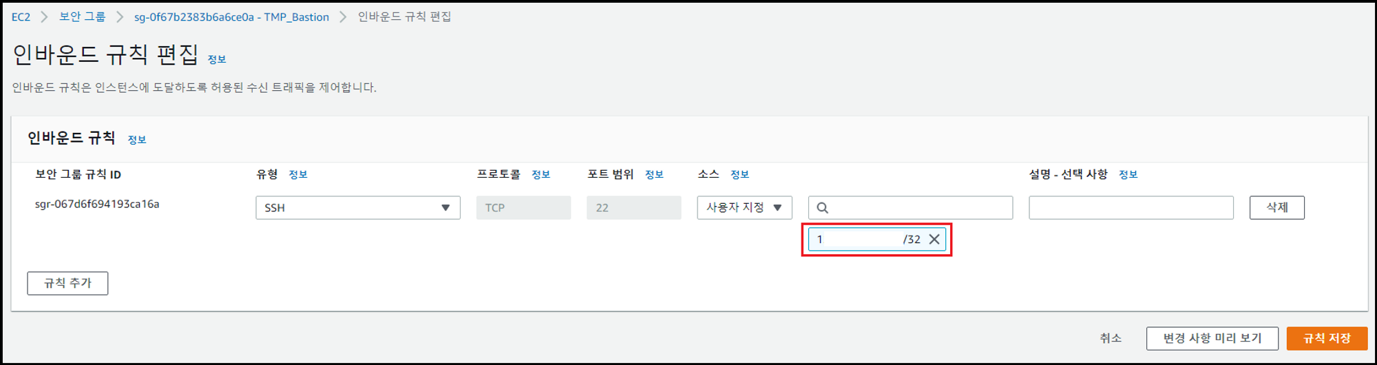 - Bastion Host의 SecurityGroup 인바운드 규칙에 담당자의 IP에서만 SSH 접근을 허용하는 정책 추가