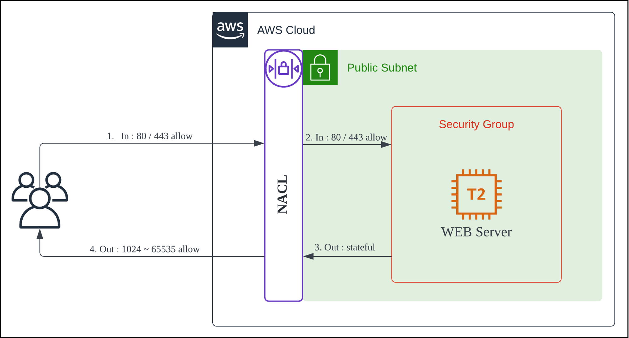 - 예) 단순 웹 서비스만을 제공하는 WEB 서버의 NACL 및 SG 적용 예시(WEB 서버에서 WAS 또는 대외 통신이 필요한 경우 설정은 달라짐)