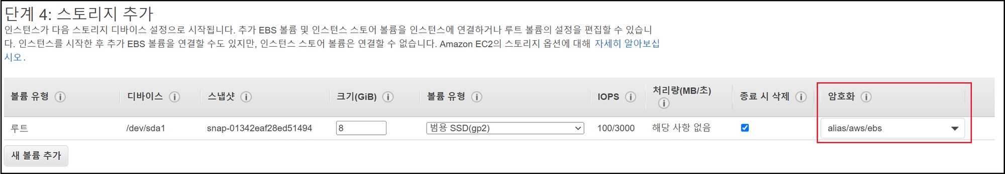 - [이 볼륨 암호화] 체크 및 KMS 키 설정