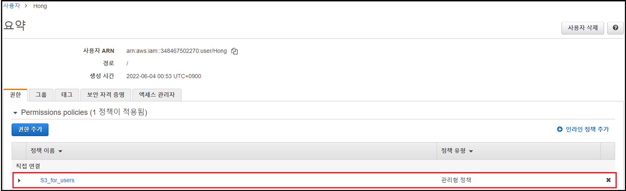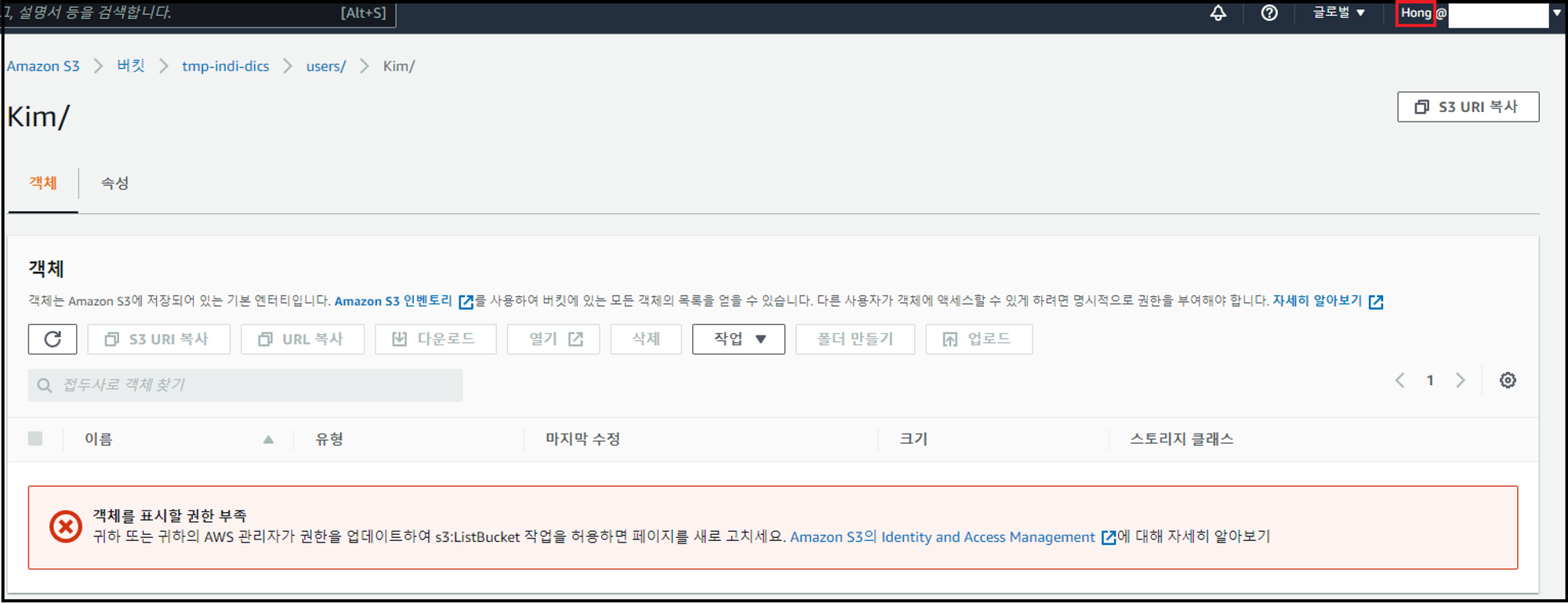 - [상황] Kim 과 Hong 두 개의 IAM 계정이 존재하는 상황에서 각각 S3 디렉터리를 할당하고자 하는 상황