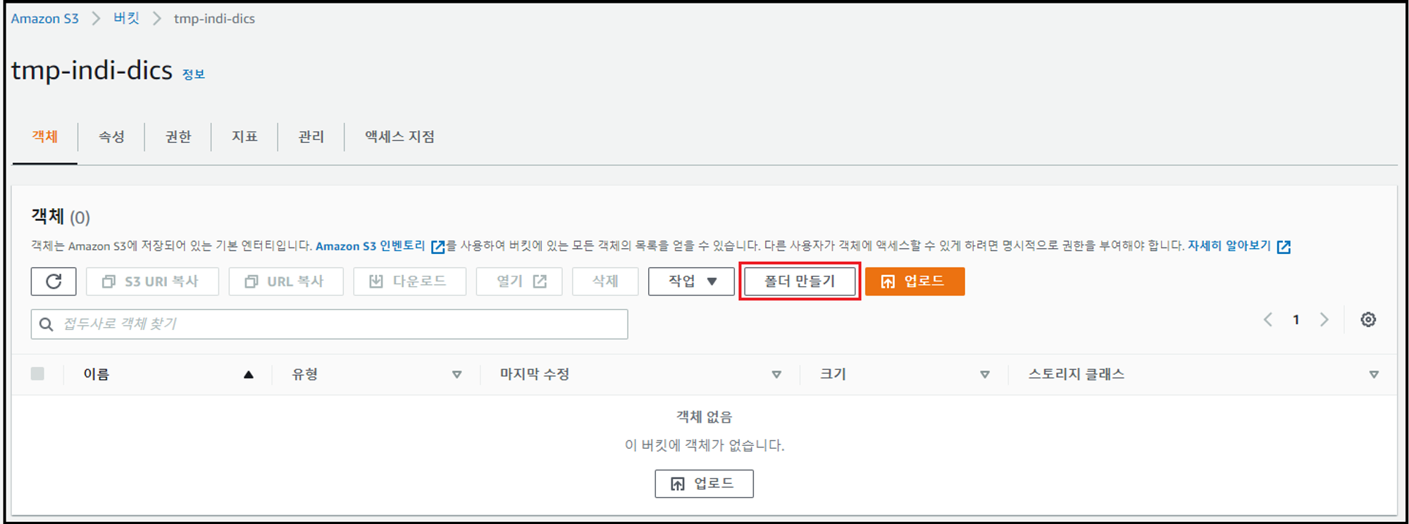 - 생성한 버킷으로 이동 → [폴더 만들기] 클릭