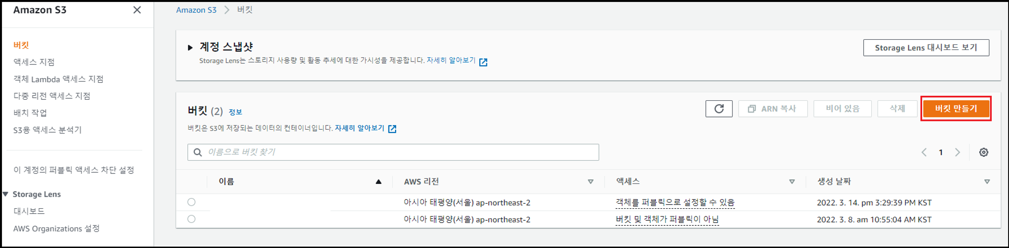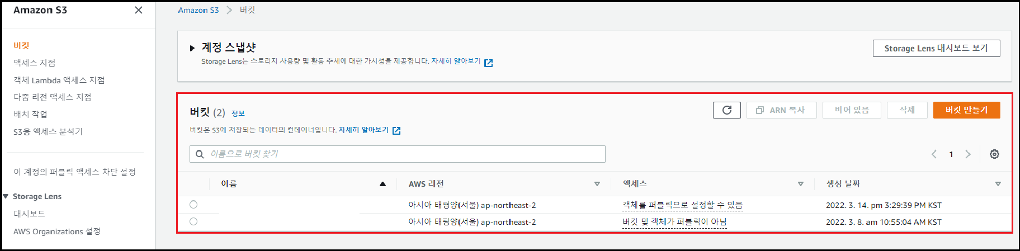 - 관리 콘솔에서 [S3] 검색 → [버킷] 메뉴 클릭