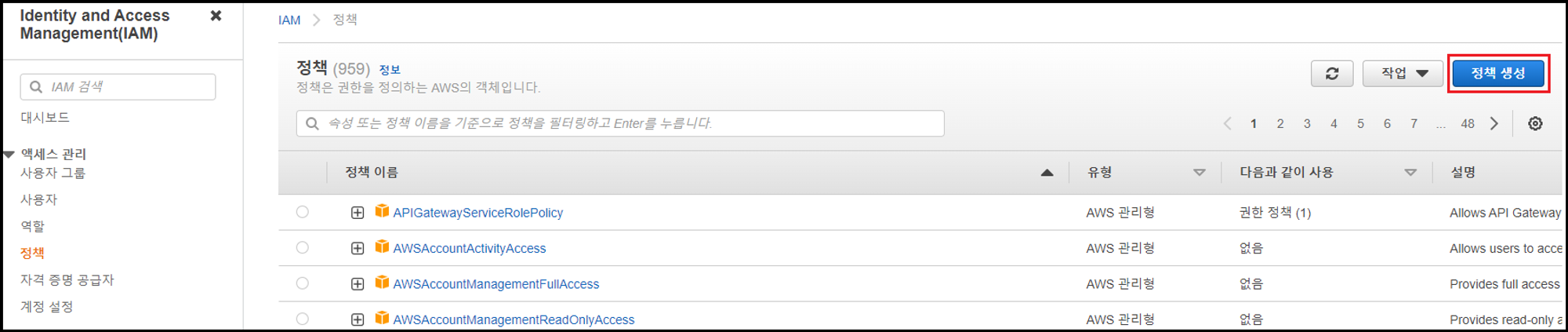 - 관리 콘솔에서 [IAM] 검색 → [정책] 메뉴 → [정책 생성] 클릭
