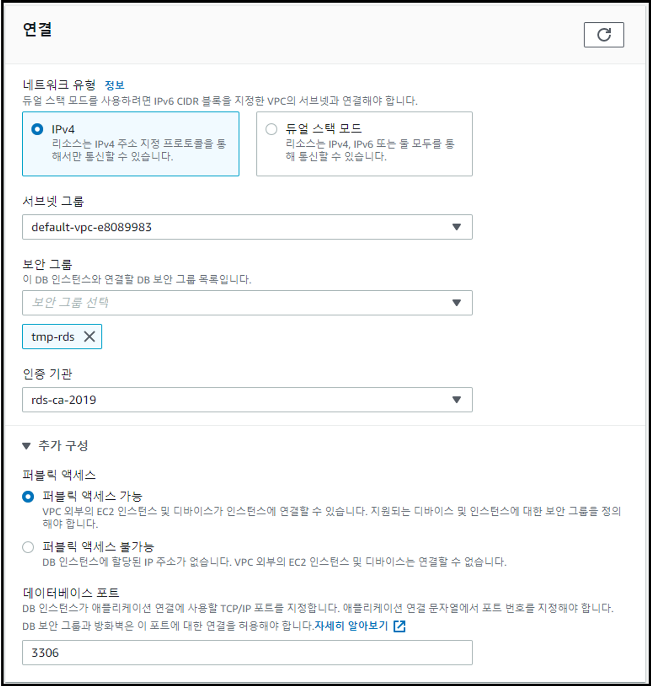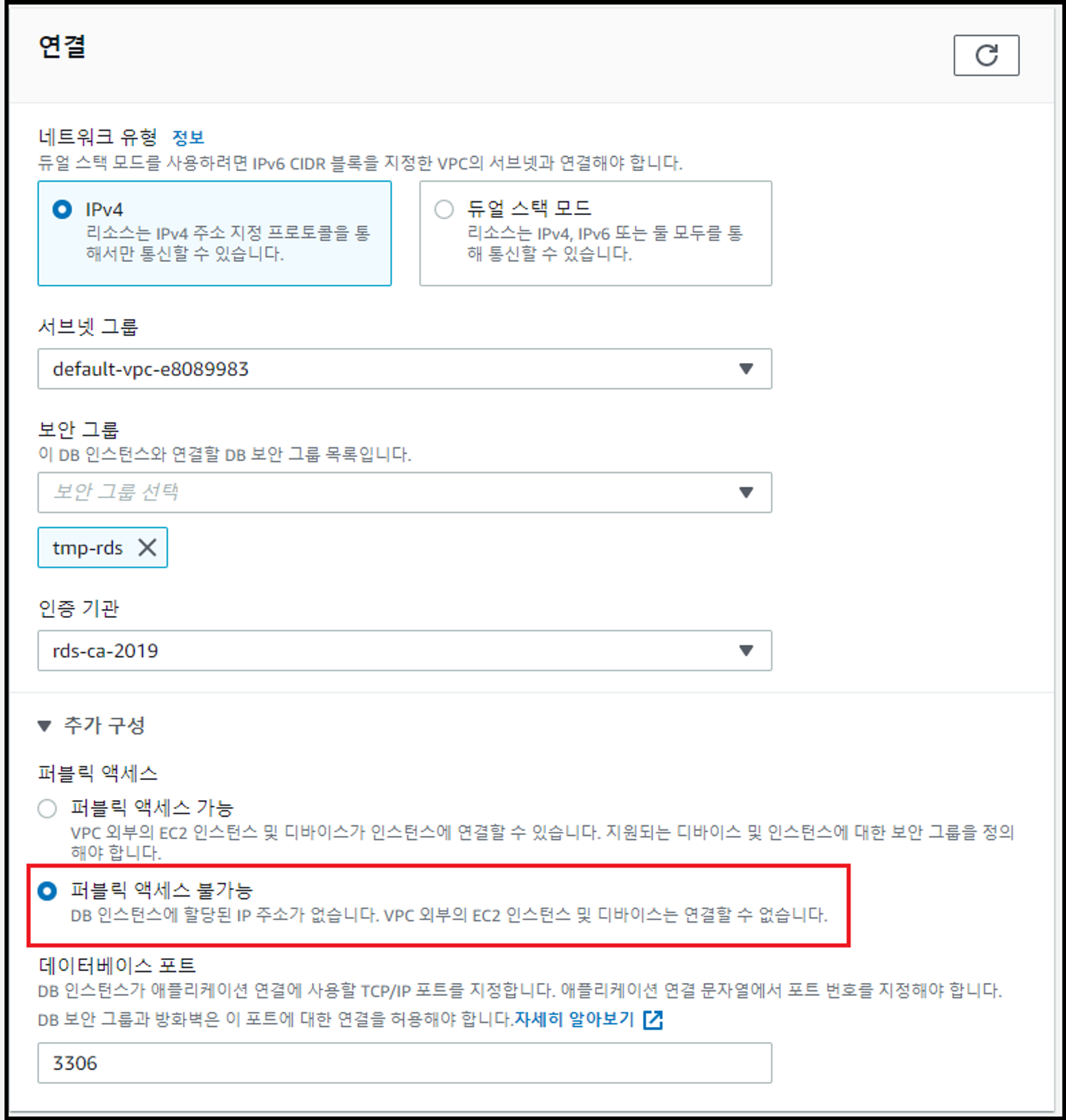 - [연결] 메뉴에서 [추가 구성] 클릭 → [퍼블릭 액세스 불가능] 체크 여부 확인