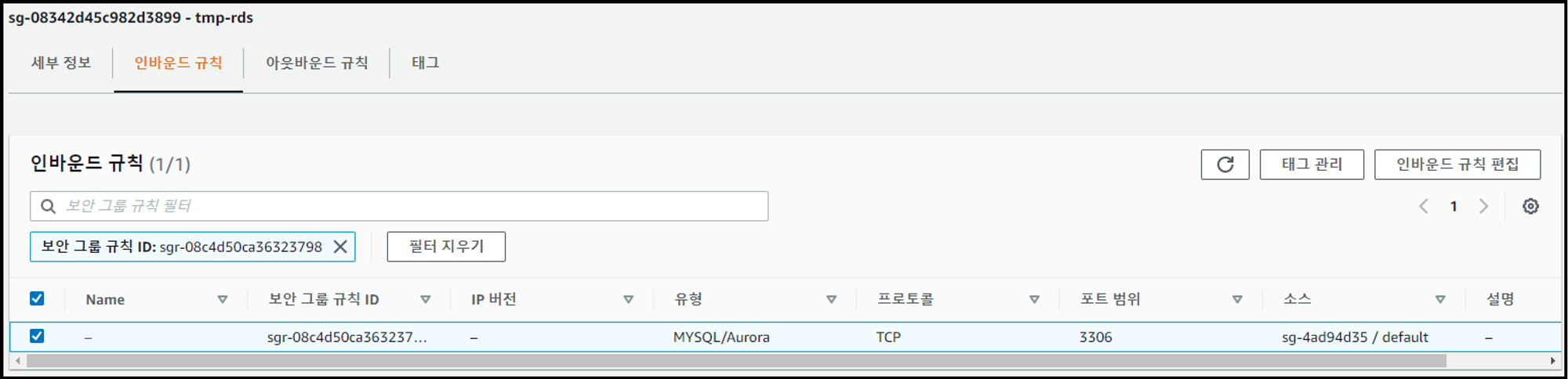 - RDS의 SecurityGroup 인바운드 규칙을 같은 VPC의 SecurityGroup에서만 접속 가능하도록 수정