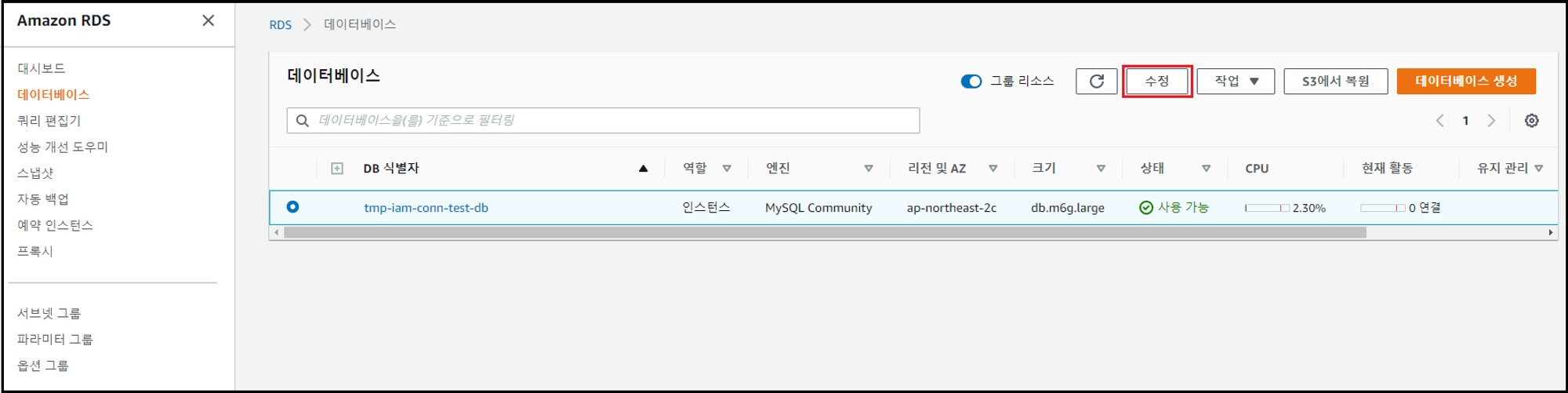 - 관리 콘솔에서 [RDS] 검색 → RDS 선택 → [수정] 클릭