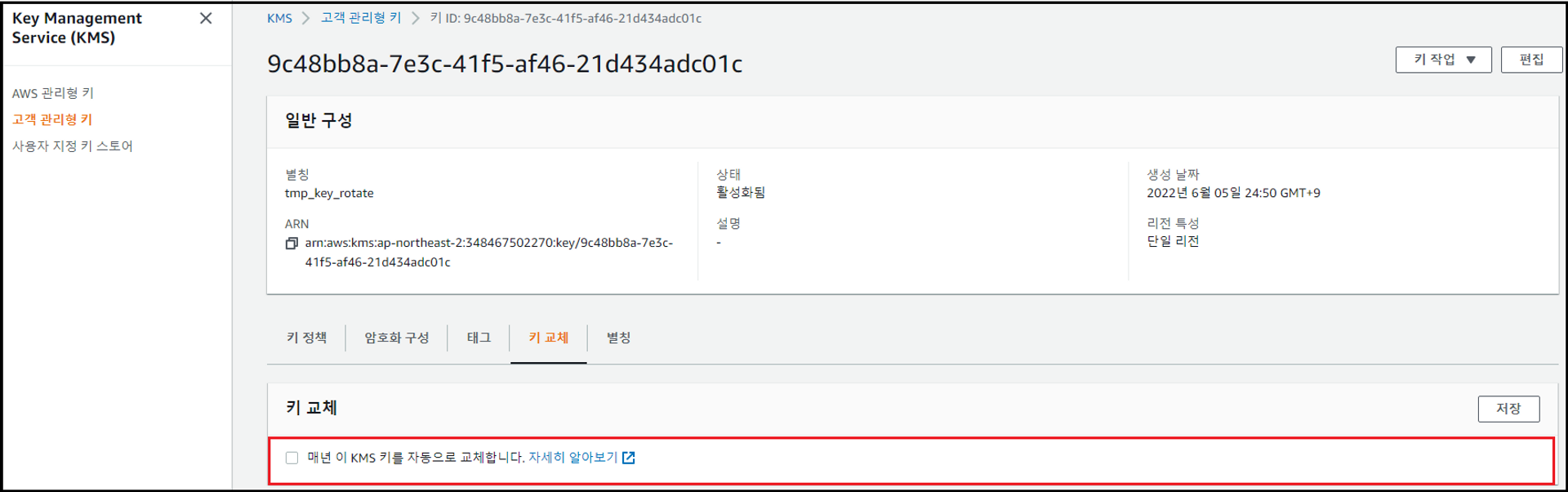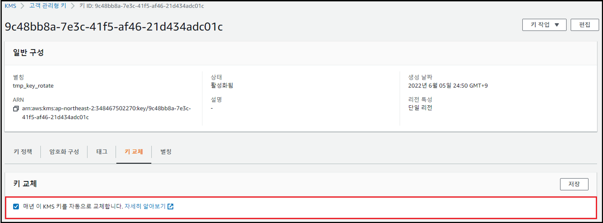 - [키 교체] 탭에서 [매년 이 KMS 키를 자동으로 교체합니다.] 체크 → 저장 클릭