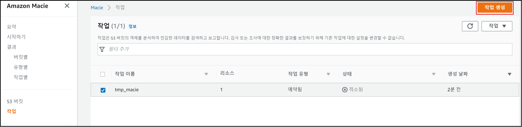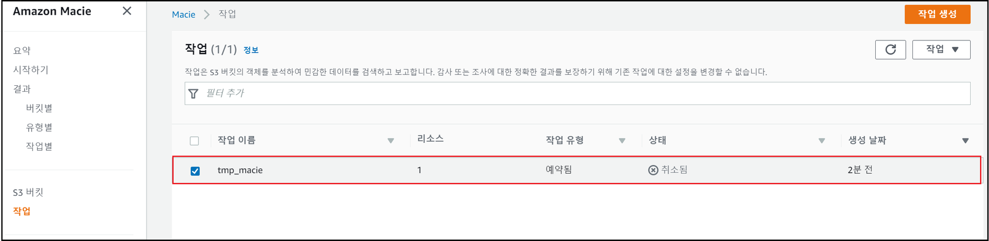 - 관리 콘솔에서 [Macie] 검색 → [작업] 메뉴 → 작업 생성 여부 확인