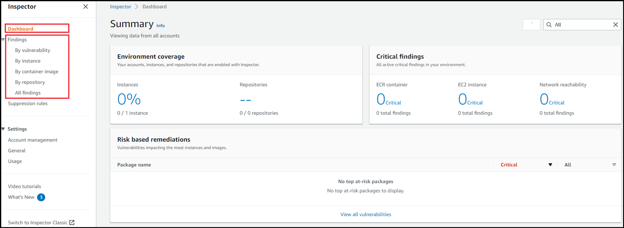 - [Dashboard] 및 [Findings] 메뉴에서 정기적 취약점 점검 여부 확인
