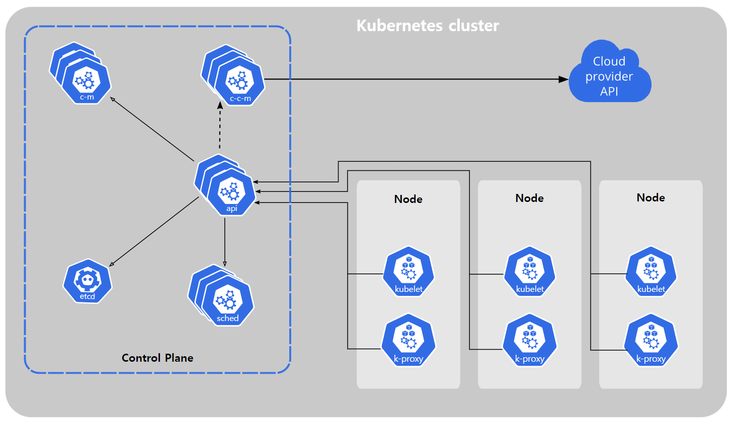 - 마스터 노드·마스터·control plane 등으로 호칭하며 쿠버네티스가 작동하는데 필요한 컴포넌트가 배포 및 실행되는 노드