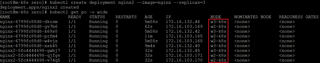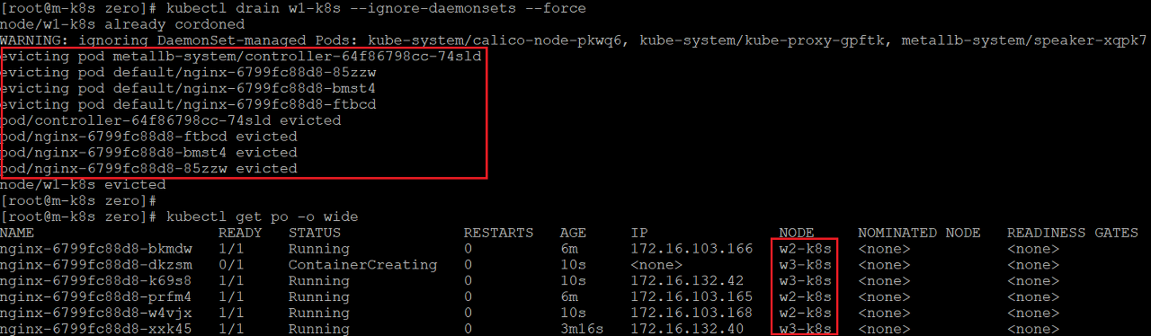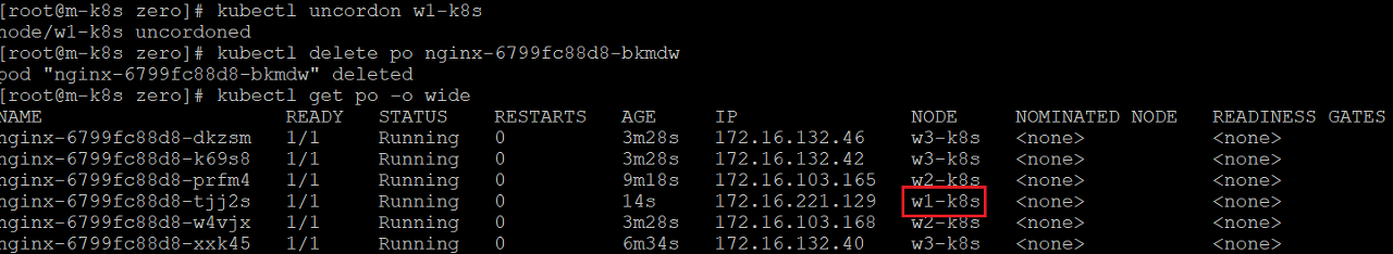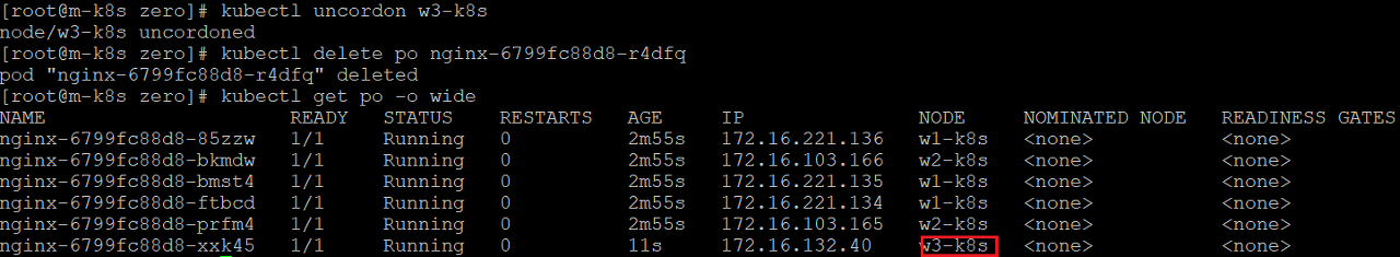 - 커든을 해제하고 다른 노드의 파드를 삭제하면 w3-k8s 노드에 재배포된 것을 확인