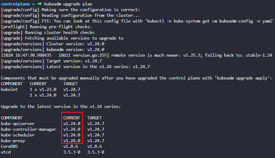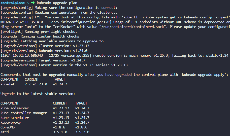 - 클러스터 업그레이드 플랜 확인 `kubeadm upgrade plan`