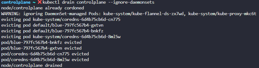 - drain 적용 `kubectl drain controlplane --ignore-daemonsets`