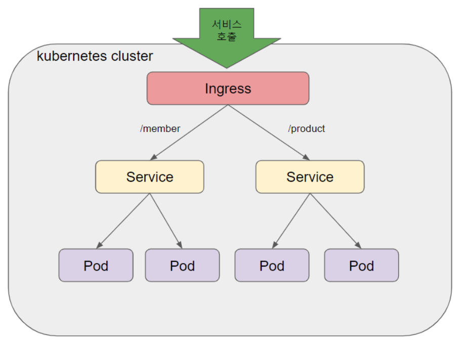 - 예를들어 클러스터에 /member 와 /product 두 개의 애플리케이션을 운영중이고 개별적인 요청을 핸들링하고자 할 때 Ingress 활용