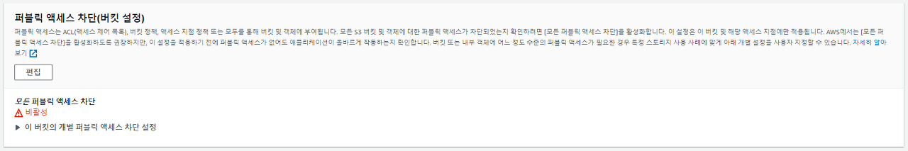 - S3 > 권한 > 퍼블릭 액세스 차단(버킷 설정) 편집 > 모든 퍼블릭 액세스 차단 체크 해제 > 변경 사항 저장
