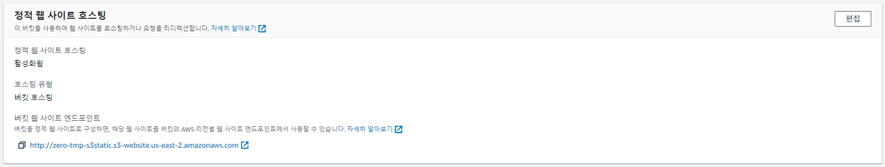 - S3 > 속성 > 정적 웹 사이트 호스팅 편집 > 활성화 > 인덱스 문서 설정 > 변경사항 저장