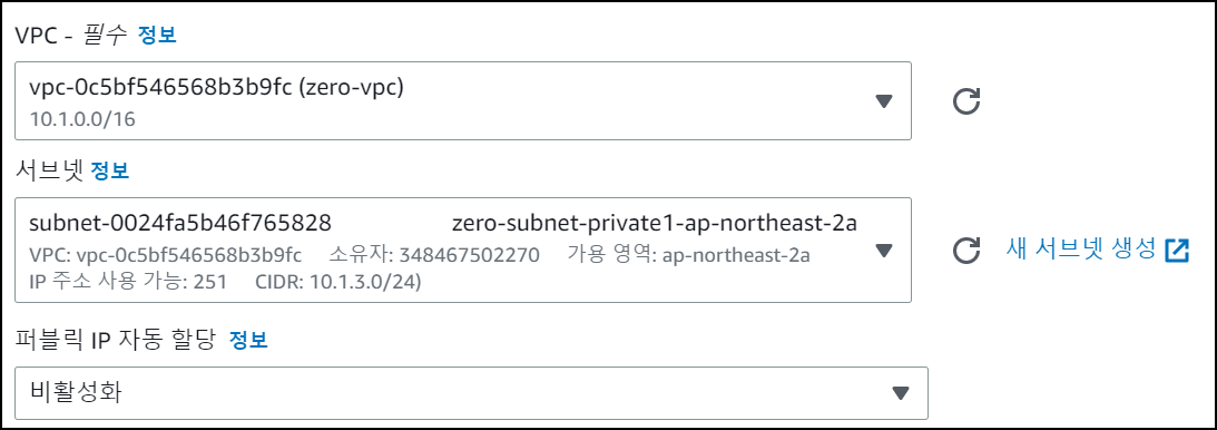 - Private subnet 설정 및 퍼블릭 IP 비활성화