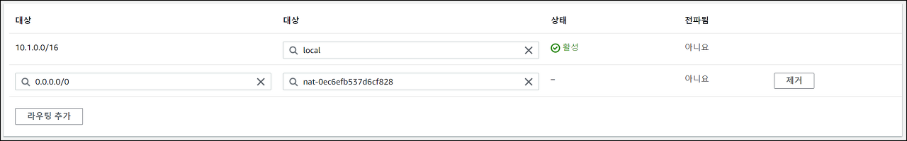 - Private subnet 라우팅 테이블에 NAT GW 추가