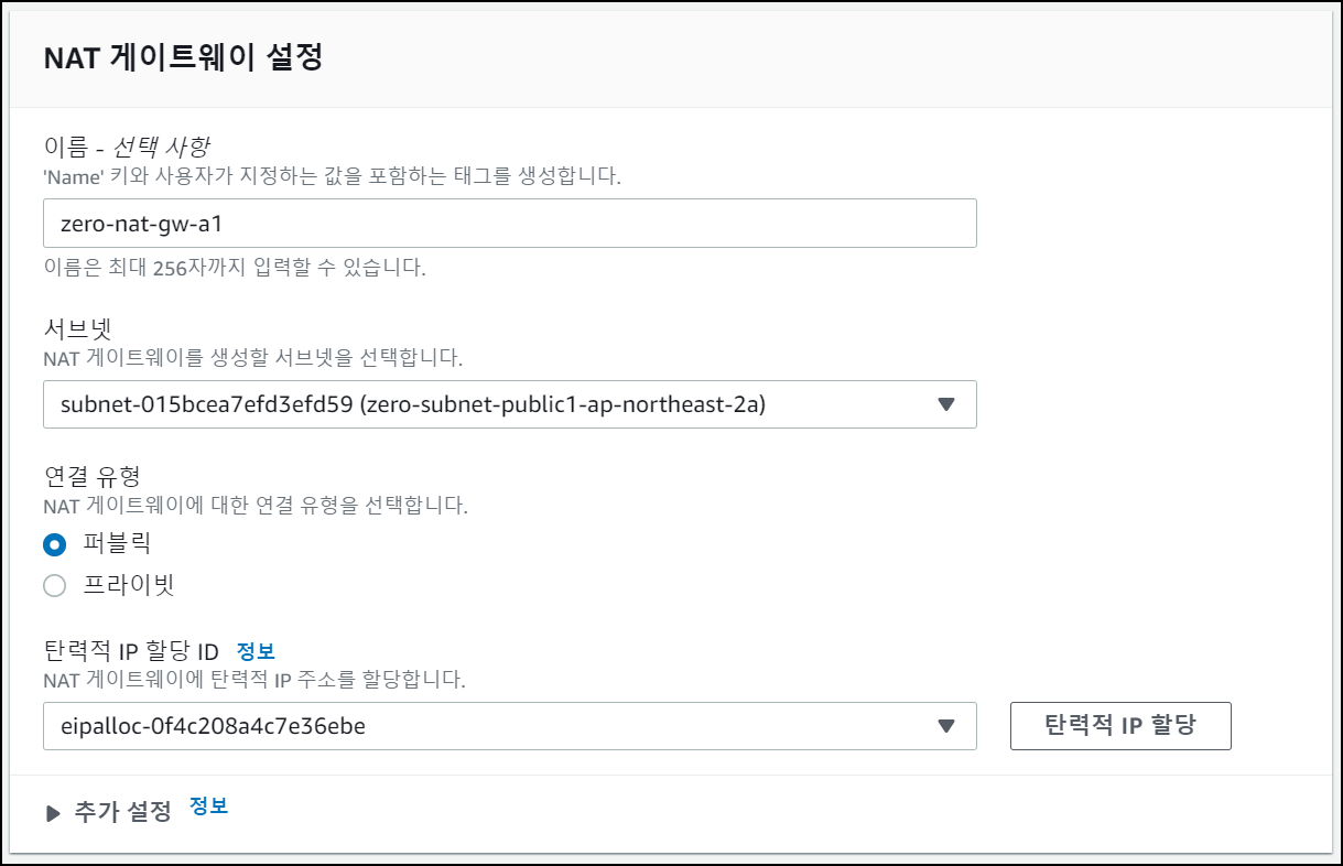 - VPC > NAT 게이트웨이 > NAT 게이트웨이 생성