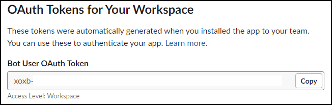 권한 부여 후 스크롤을 위로 올려 "OAuth Tokens for Your Workspace"에서 "Install App to Workspace"를 클릭합니다. 워크스페이스에 bot이 설치되면 xoxb로 시작하는 bot 토큰 값을 확인할 수 있습니다. 해당 토큰은 유·노출되지 않도록 주의합니다.