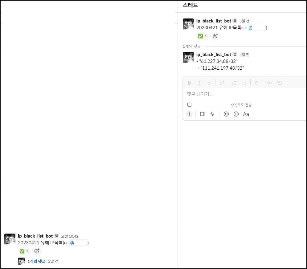 특정 채널에 "유해 IP 목록"이라는 메세지를 발송하고 해당 메세지의 댓글에 위협IP를 기록하는 부분입니다. IP의 수가 많을 경우 채널의 가독성을 저해할 우려가 있어 댓글에 기록하였습니다. 또한 메세지가 누락되지 않도록 관련 엔지니어를 호출합니다. 아래와 같이 예쁘게 내용을 확인할 수 있습니다.